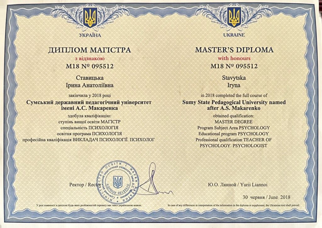 Ступінь вищої освіти МАГІСТР. Професійна кваліфікація ВИКЛАДАЧ ПСИХОЛОГІЇ, ПСИХОЛОГ.