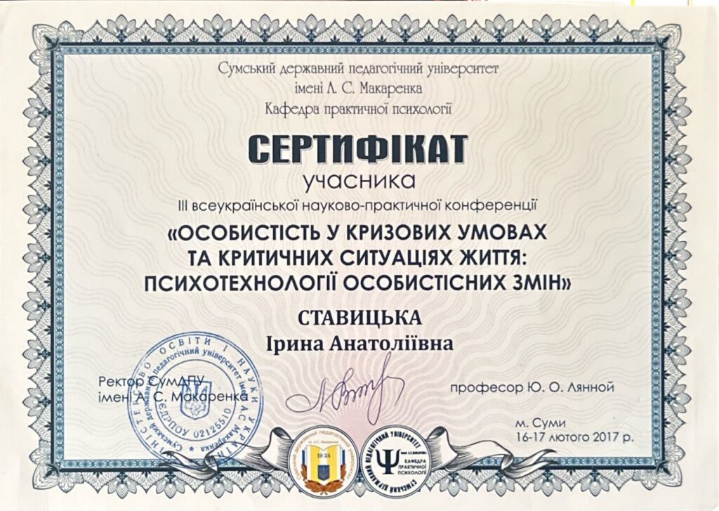⁃ всеукраїнська наукова практична конференція «Особистість у кризових умовах та критичних ситуаціях: психотехнології особистісних змін»